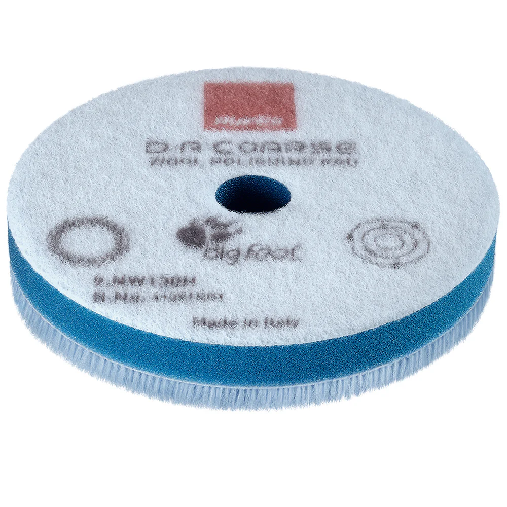 The coarse wool pads are constructed using two distinct fiber lengths creating a dual-density wool surface and a specific visible pattern. More than just an aesthetic detail, this configuration provides a great balance of cutting power and finishing ability when compared to traditional or single-density wool pads. Coarse or medium abrasive compounds are recommended.