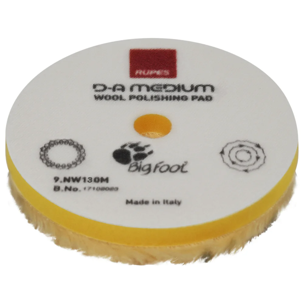 The RUPES yellow medium wool pad range features a consistent 15mm fiber length through the entirety of the pad's surface. This soft and flexible wool, paired with a soft and flexible yellow foam backing, provides excellent cutting of moderate defects, and excellent finishing ability on most surfaces. Coarse, medium, or fine abrasive compounds are recommended.